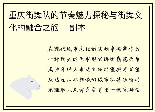 在现代城市文化的浪潮中,街舞作为一种新兴的艺术形式,逐渐崭露头角,成为年轻人表达自我的重要方式。重庆,这座山水相依的城市,以其独特的地理和人文背景,孕育出一批充满活力的街舞团队。他们不仅在舞台上展现出令人叹为观止的节奏魅力,还通过街舞文化与社会、历史和地域特色深度融合。在本文中,我们将从四个方面探讨“重庆街舞队”的节奏魅力及其与街舞文化融合之旅,包括重庆街舞的发展历程、团队风格特点、社会影响力以及未来的发展趋势。通过这些方面的分析,我们希望能够更全面地理解重庆街舞背后的故事与情感。